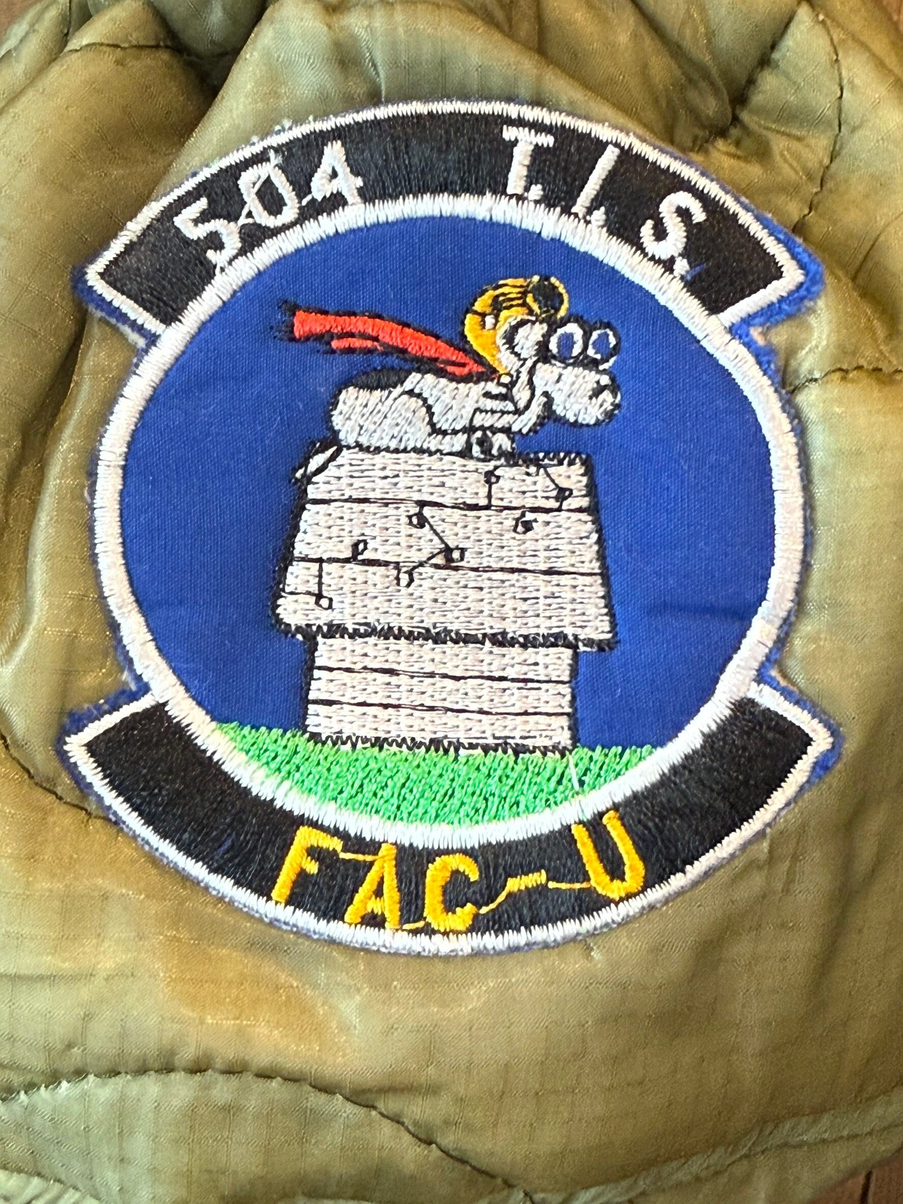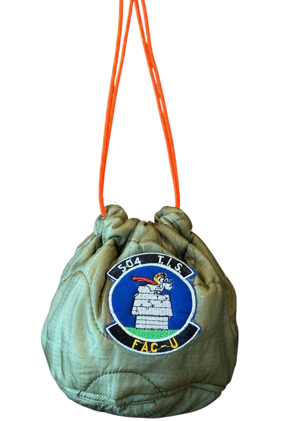 米軍実物M-65ライナーをリメイクした巾着バッグに、ヴィンテージワッペンを付けたバッグです。