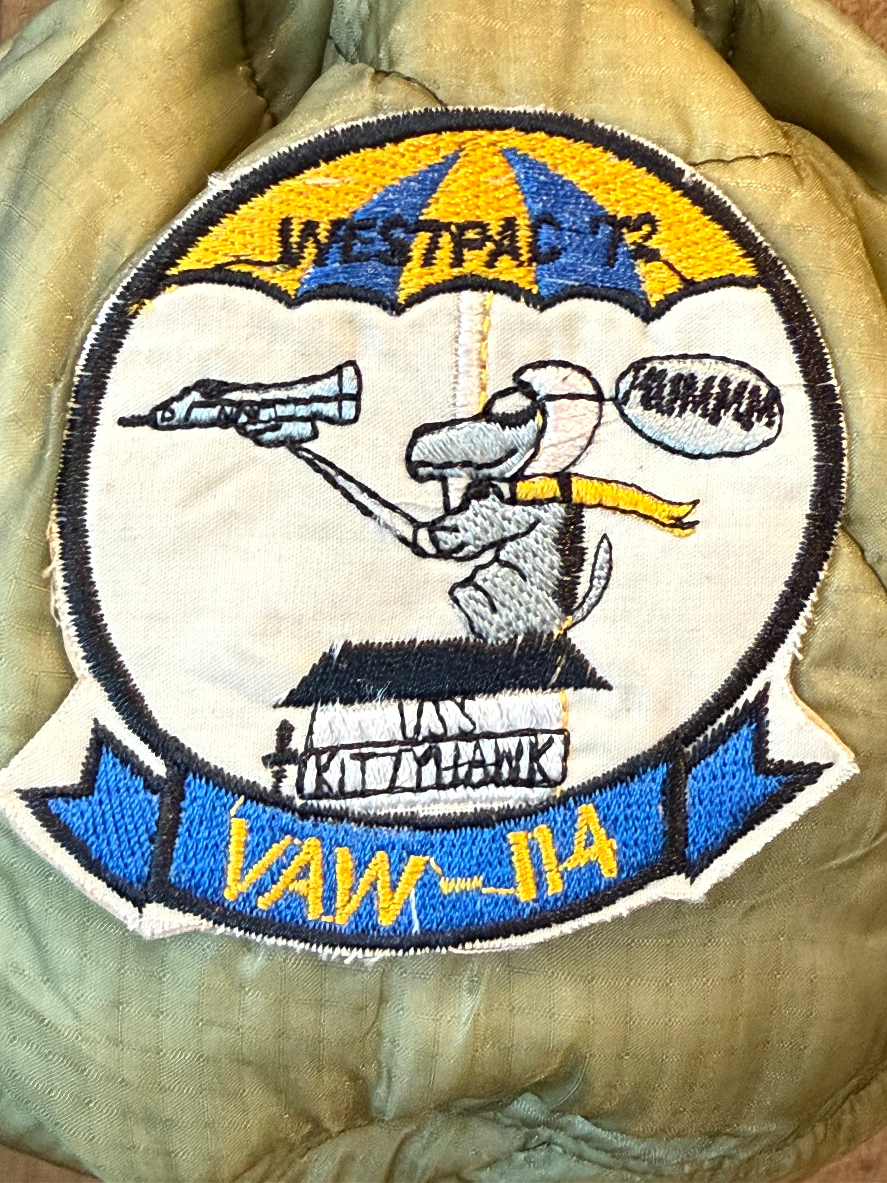 米軍実物M-65ライナーをリメイクした巾着バッグに、ヴィンテージワッペンを付けたバッグです。