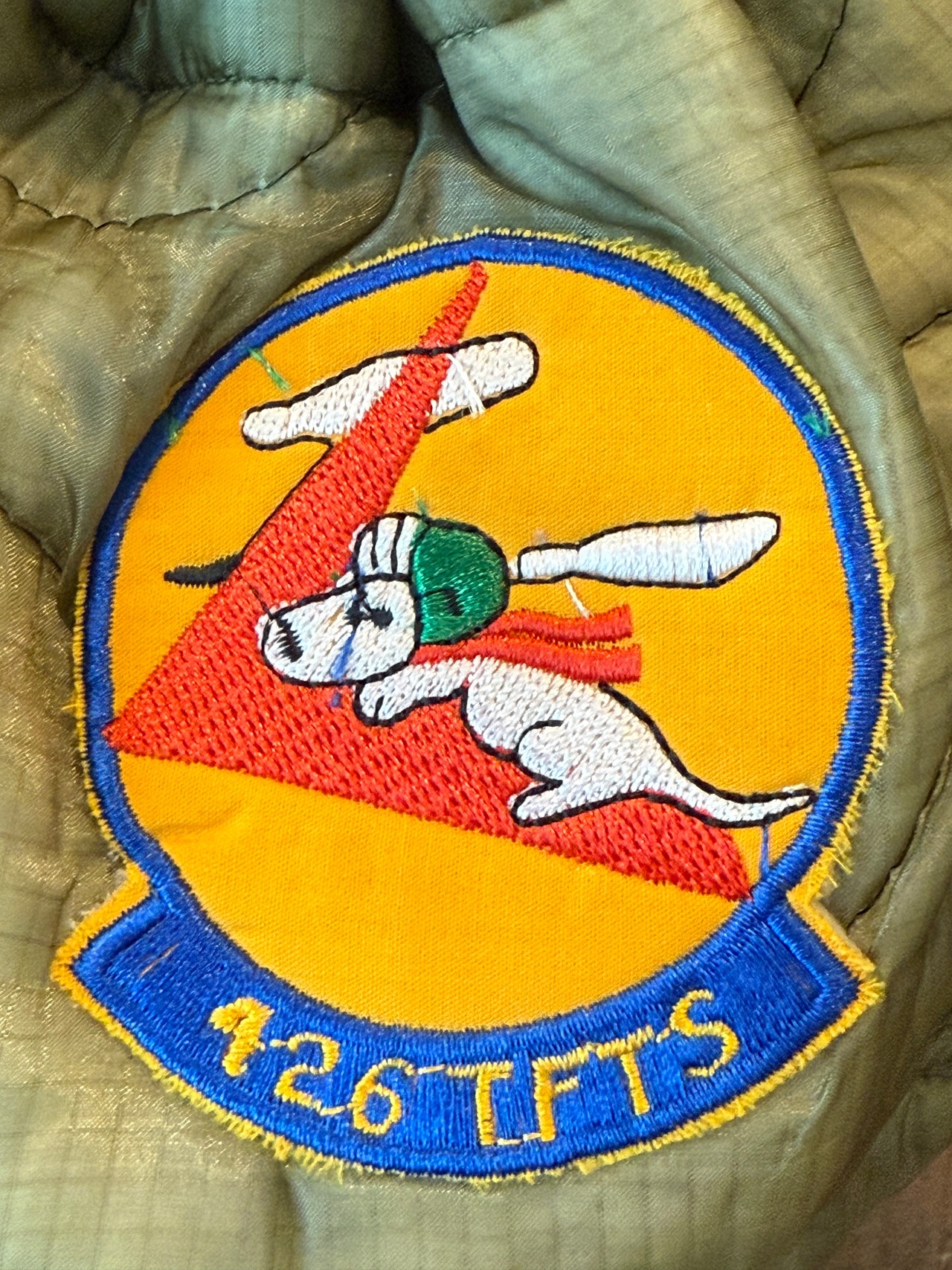 米軍実物M-65ライナーをリメイクした巾着バッグに、ヴィンテージワッペンを付けたバッグです。