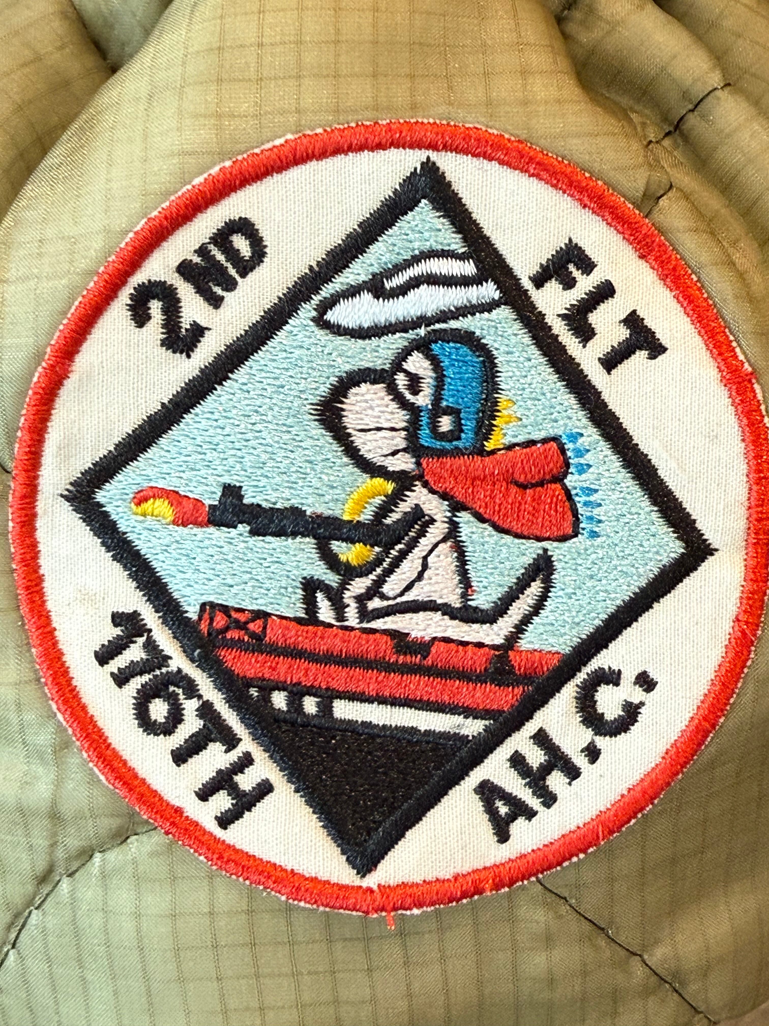 米軍実物M-65ライナーをリメイクした巾着バッグに、ヴィンテージワッペンを付けたバッグです。